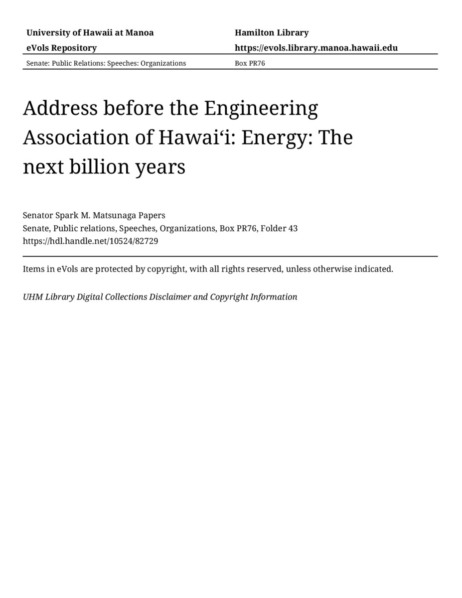 - Address before the Engineering Association of Hawaiʻi: Energy: The next billion years