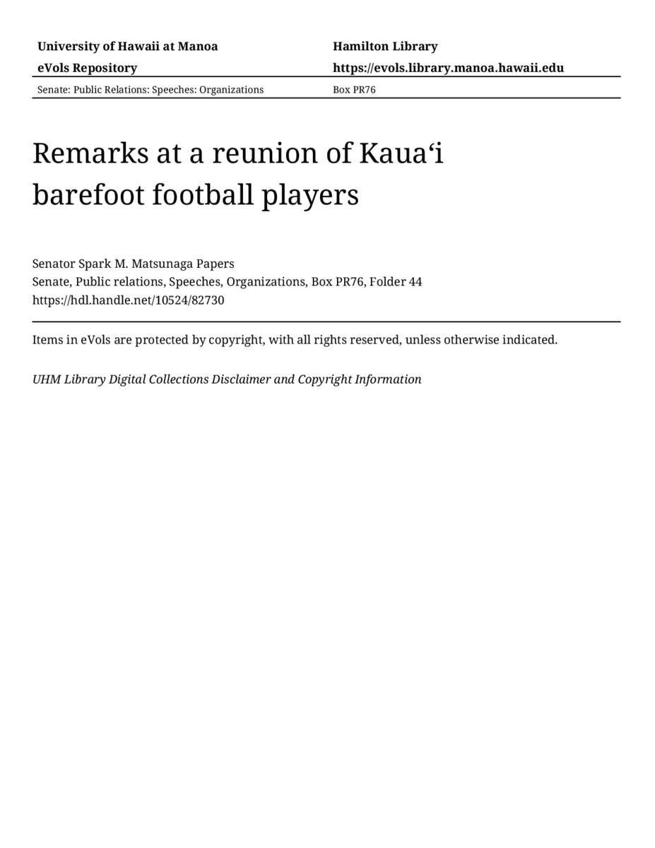 Remarks at a reunion of Kauaʻi barefoot football players, 07/10/82, Senate, Public relations, Speeches, Organizations, Box PR76, Folder 44, Senator Spark M. Matsunaga Papers, Hawaiʻi Congressional Papers Collection, University of Hawaiʻi at Mānoa Library, Honolulu, HI. https://omekas-congress.lib.wvu.edu/catalog/10524_82730 (accessed April 18, 2026).