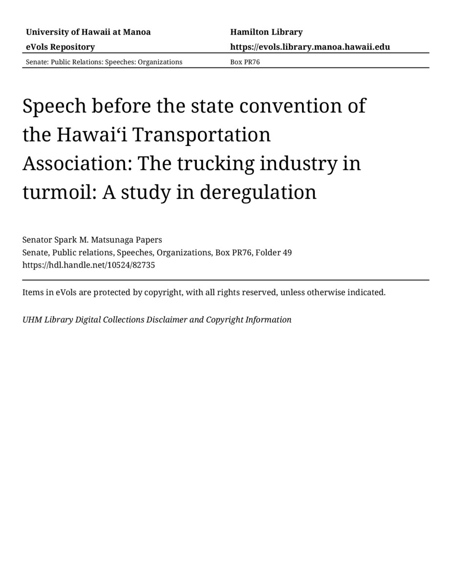 Speech before the state convention of the Hawaiʻi Transportation Association: The trucking industry in turmoil: A study in deregulation, 09/09/82, Senate, Public relations, Speeches, Organizations, Box PR76, Folder 49, Senator Spark M. Matsunaga Papers, Hawaiʻi Congressional Papers Collection, University of Hawaiʻi at Mānoa Library, Honolulu, HI. https://omekas-congress.lib.wvu.edu/catalog/10524_82735 (accessed April 20, 2026).