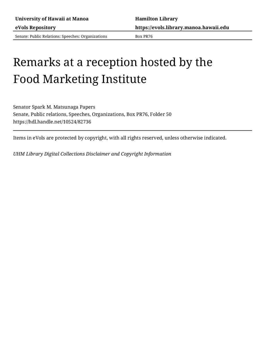 Remarks at a reception hosted by the Food Marketing Institute, 09/22/82, Senate, Public relations, Speeches, Organizations, Box PR76, Folder 50, Senator Spark M. Matsunaga Papers, Hawaiʻi Congressional Papers Collection, University of Hawaiʻi at Mānoa Library, Honolulu, HI. https://omekas-congress.lib.wvu.edu/catalog/10524_82736 (accessed April 20, 2026).