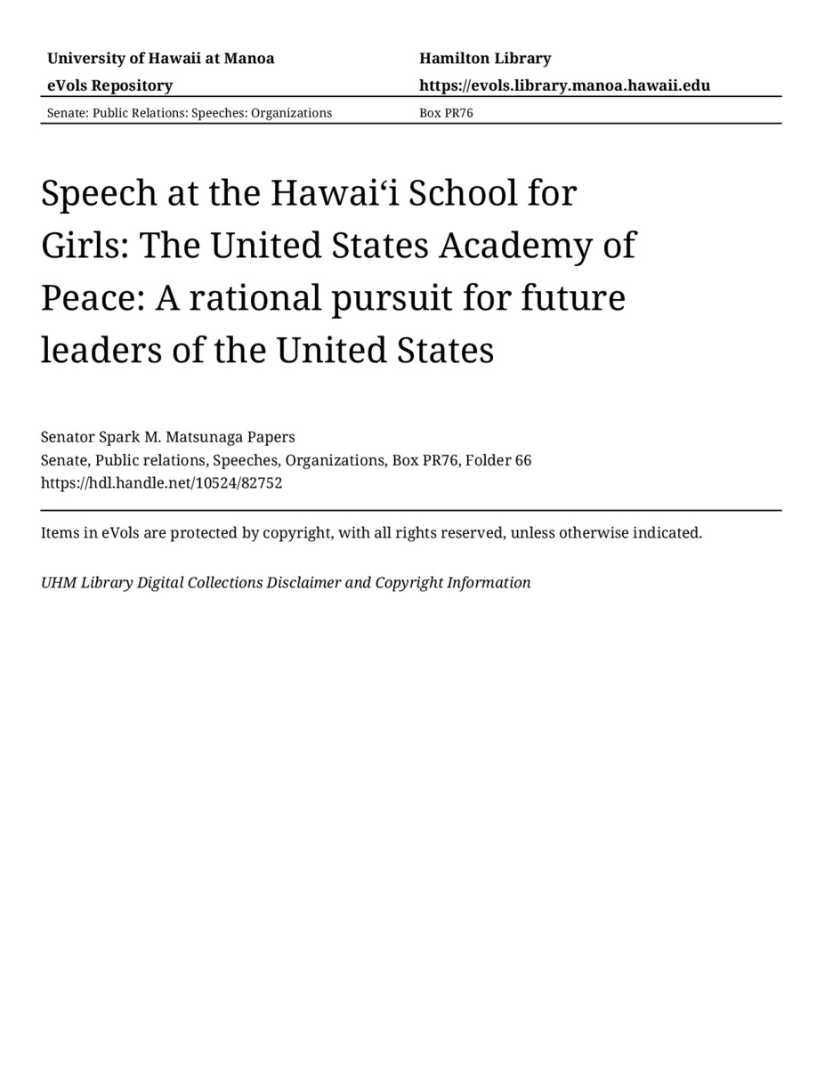Speech at the Hawaiʻi School for Girls: The United States Academy of Peace: A rational pursuit for future leaders of the United States, 12/10/82, Senate, Public relations, Speeches, Organizations, Box PR76, Folder 66, Senator Spark M. Matsunaga Papers, Hawaiʻi Congressional Papers Collection, University of Hawaiʻi at Mānoa Library, Honolulu, HI. https://omekas-congress.lib.wvu.edu/catalog/10524_82752 (accessed April 14, 2026).