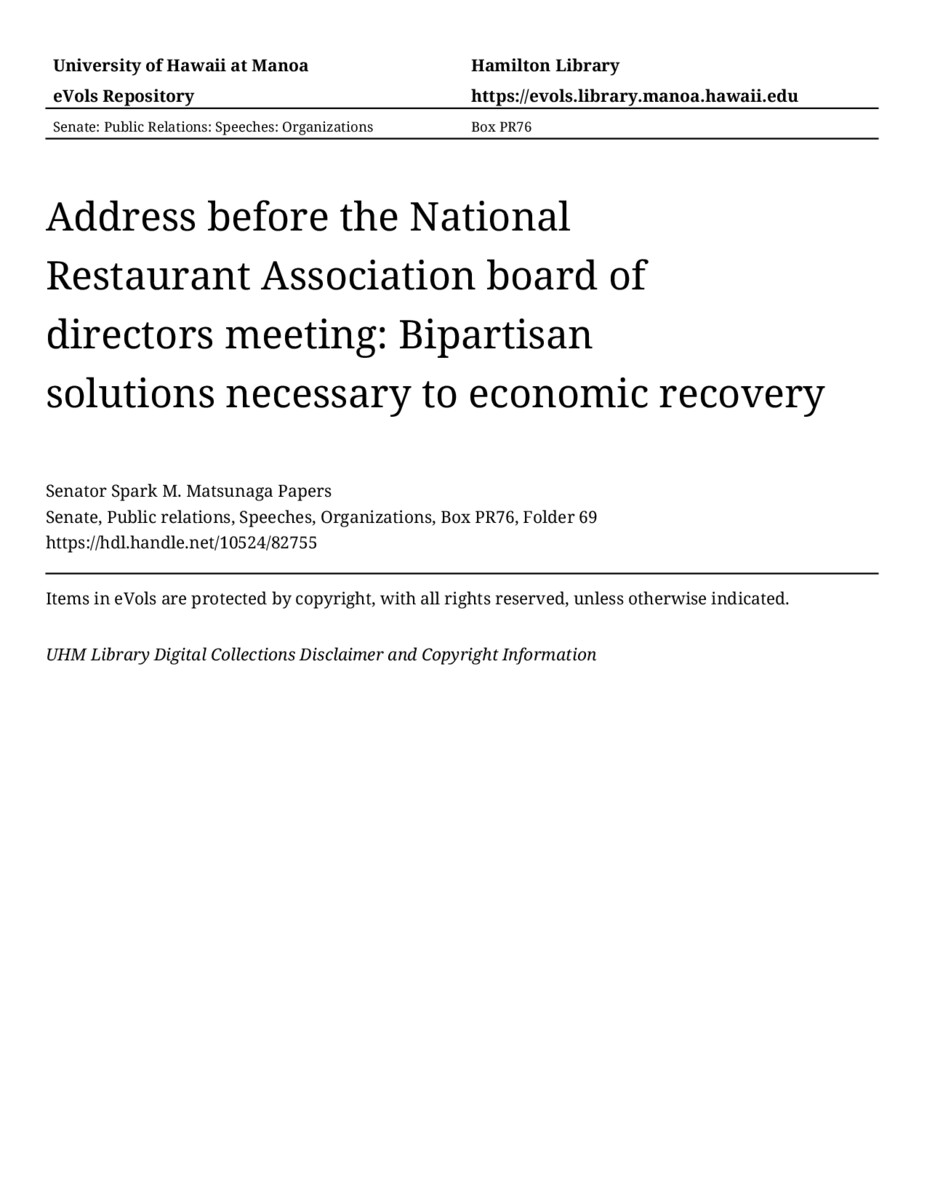 - Address before the National Restaurant Association board of directors meeting: Bipartisan solutions necessary to economic recovery
