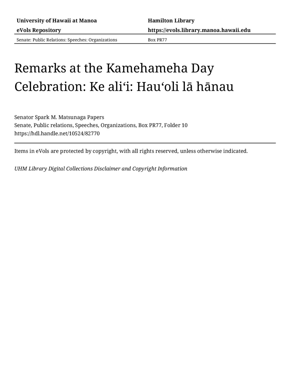 - Remarks at the Kamehameha Day Celebration: Ke aliʻi: Hauʻoli lā hānau