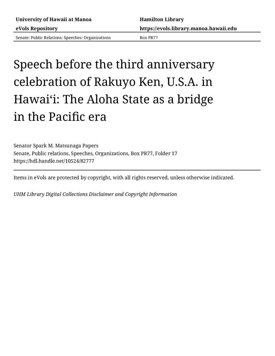 Speech before the third anniversary celebration of Rakuyo Ken, U.S.A. in Hawaiʻi: The Aloha State as a bridge in the Pacific era