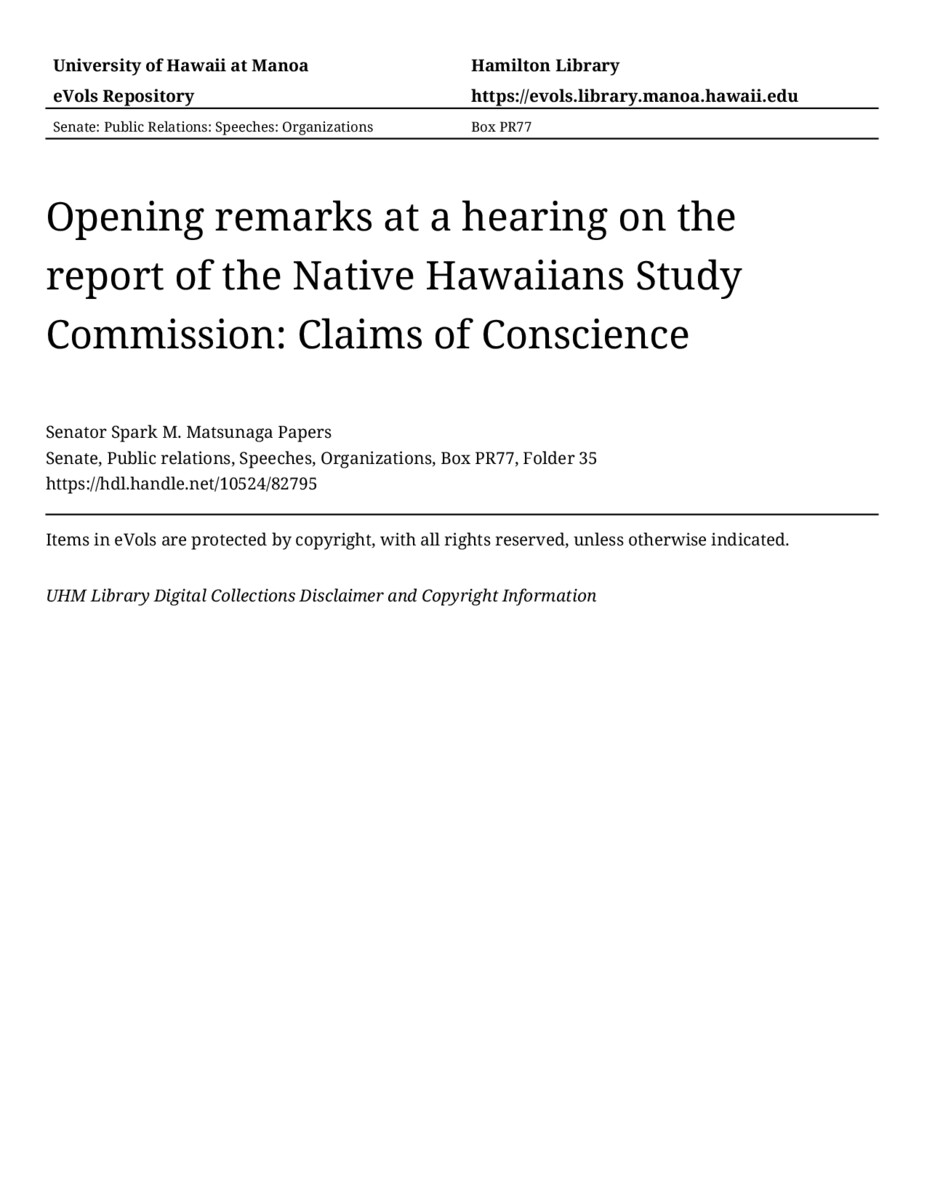 - Opening remarks at a hearing on the report of the Native Hawaiians Study Commission: Claims of Conscience