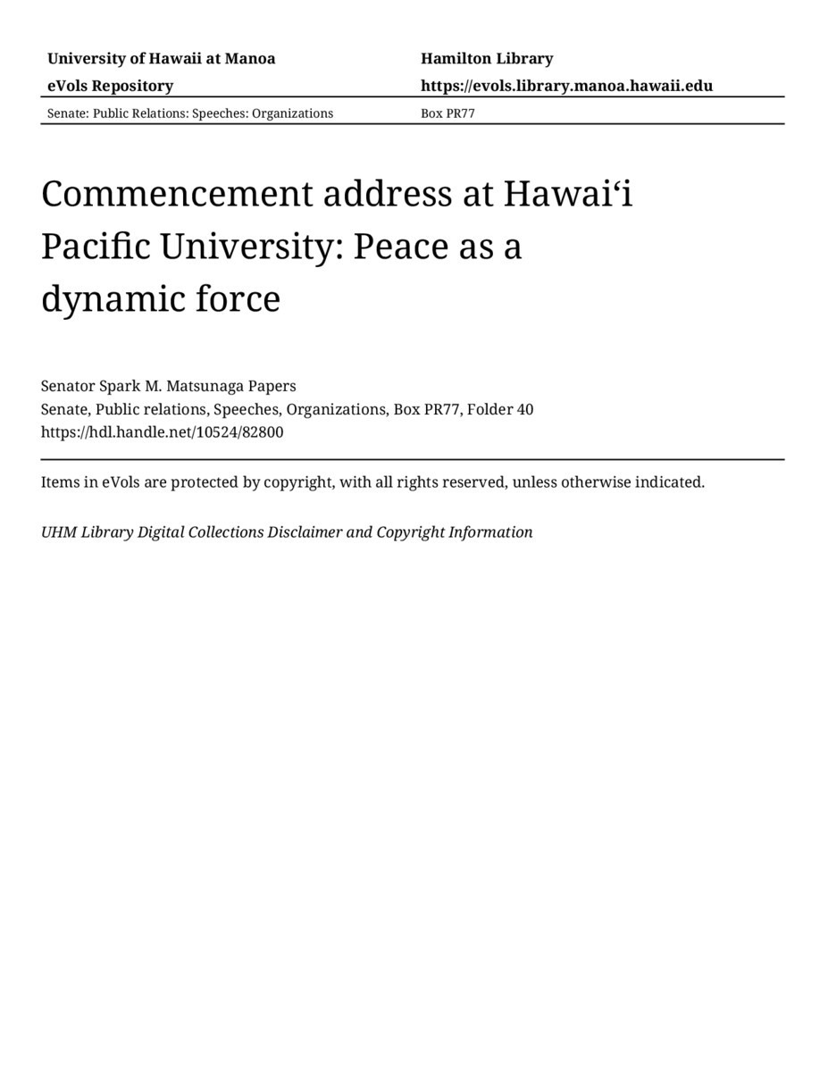- Commencement address at Hawaiʻi Pacific University: Peace as a dynamic force