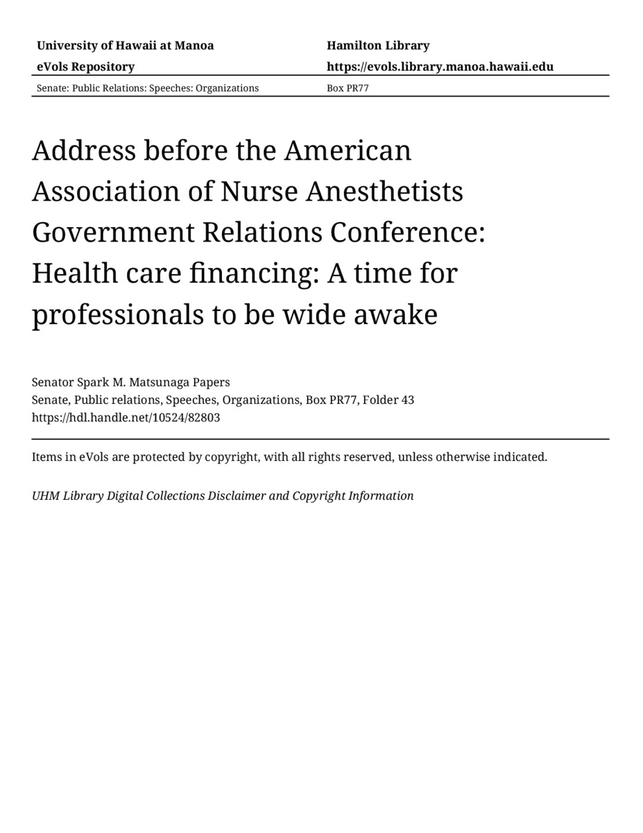 Address before the American Association of Nurse Anesthetists Government Relations Conference: Health care financing: A time for professionals to be wide awake, 05/20/84, Senate, Public relations, Speeches, Organizations, Box PR77, Folder 43, Senator Spark M. Matsunaga Papers, Hawaiʻi Congressional Papers Collection, University of Hawaiʻi at Mānoa Library, Honolulu, HI. https://omekas-congress.lib.wvu.edu/catalog/10524_82803 (accessed April 17, 2026).