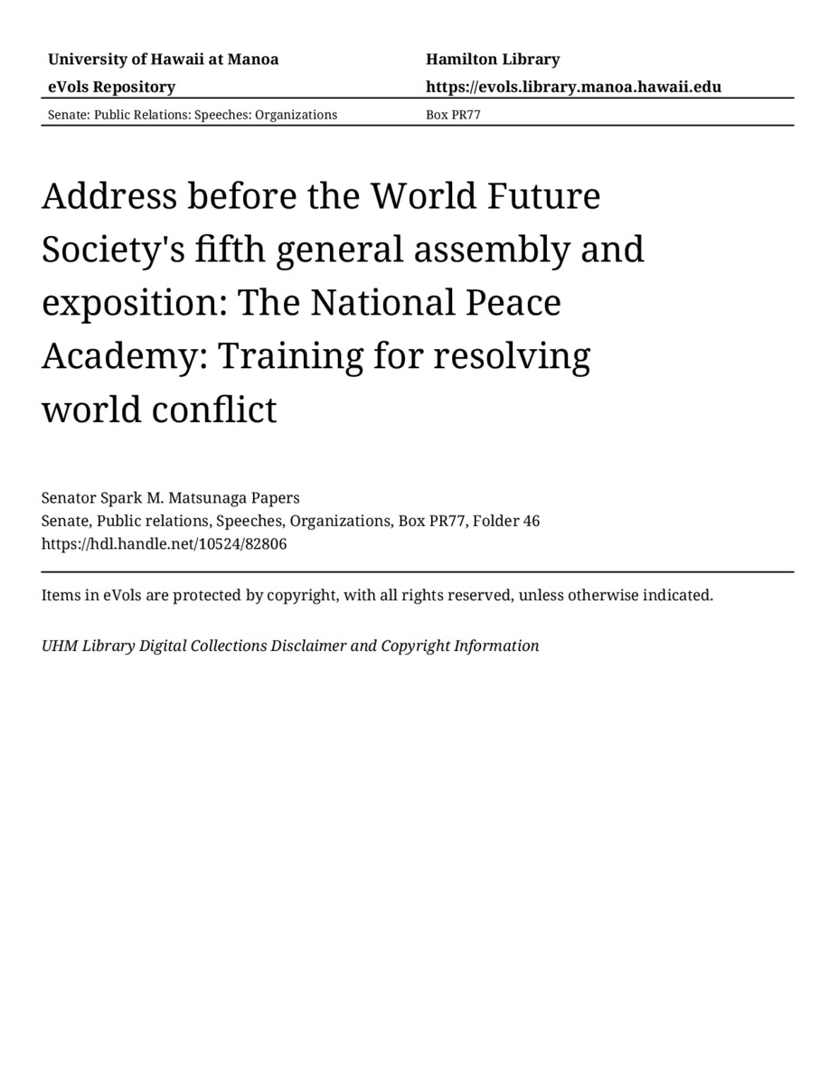 Address before the World Future Society's fifth general assembly and exposition: The National Peace Academy: Training for resolving world conflict, 06/11/83, Senate, Public relations, Speeches, Organizations, Box PR77, Folder 46, Senator Spark M. Matsunaga Papers, Hawaiʻi Congressional Papers Collection, University of Hawaiʻi at Mānoa Library, Honolulu, HI. https://omekas-congress.lib.wvu.edu/catalog/10524_82806 (accessed April 23, 2026).