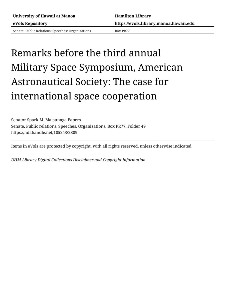 Remarks before the third annual Military Space Symposium, American Astronautical Society: The case for international space cooperation, 06/21/84, Senate, Public relations, Speeches, Organizations, Box PR77, Folder 49, Senator Spark M. Matsunaga Papers, Hawaiʻi Congressional Papers Collection, University of Hawaiʻi at Mānoa Library, Honolulu, HI. https://omekas-congress.lib.wvu.edu/catalog/10524_82809 (accessed April 20, 2026).