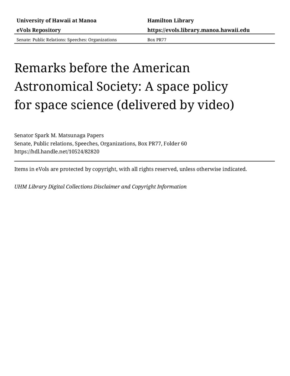 - Remarks before the American Astronomical Society: A space policy for space science (delivered by video)