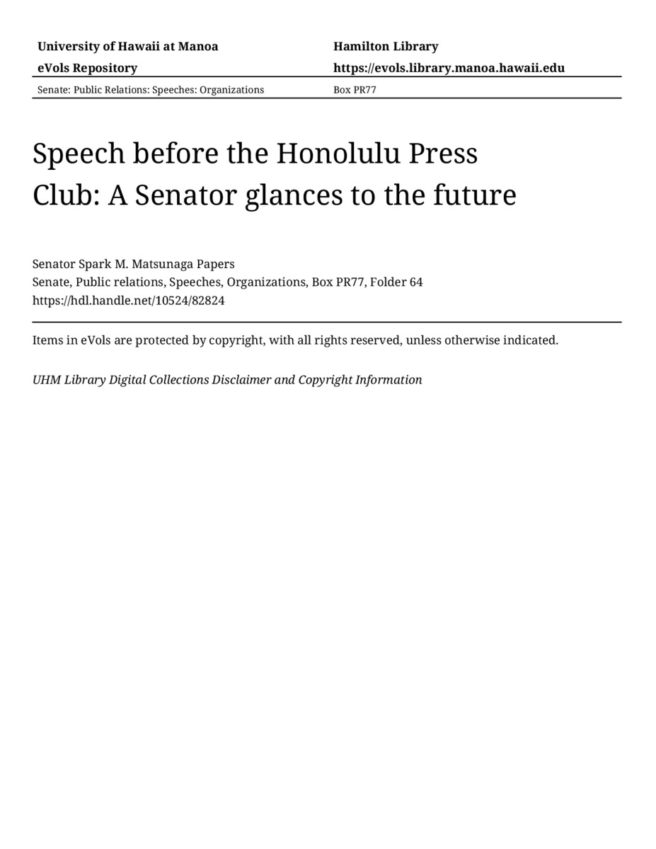 - Speech before the Honolulu Press Club: A Senator glances to the future