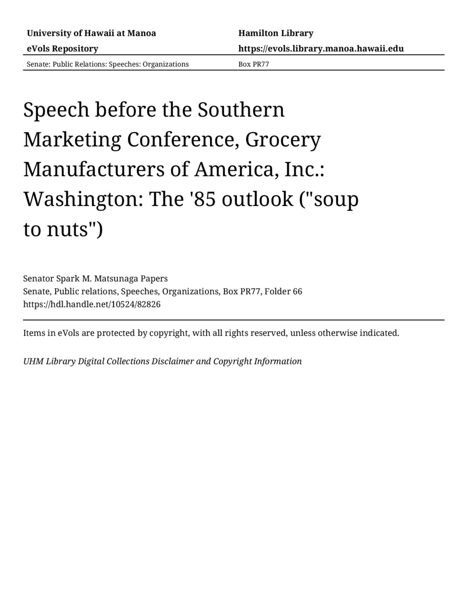 Speech before the Southern Marketing Conference, Grocery Manufacturers of America, Inc.: Washington: The '85 outlook ("soup to nuts")