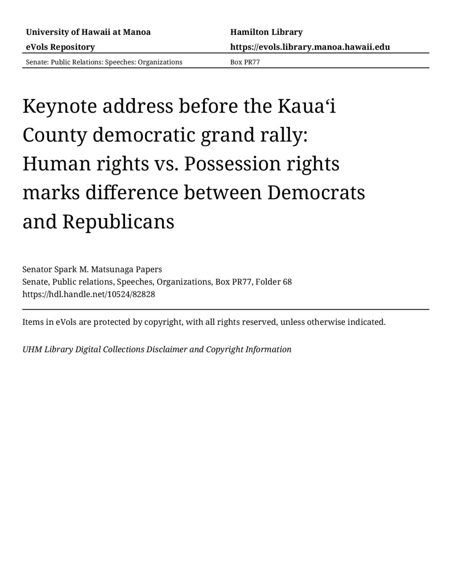 Keynote address before the Kauaʻi County democratic grand rally: Human rights vs. Possession rights marks difference between Democrats and Republicans, 11/01/84, Senate, Public relations, Speeches, Organizations, Box PR77, Folder 68, Senator Spark M. Matsunaga Papers, Hawaiʻi Congressional Papers Collection, University of Hawaiʻi at Mānoa Library, Honolulu, HI. https://omekas-congress.lib.wvu.edu/catalog/10524_82828 (accessed April 19, 2026).