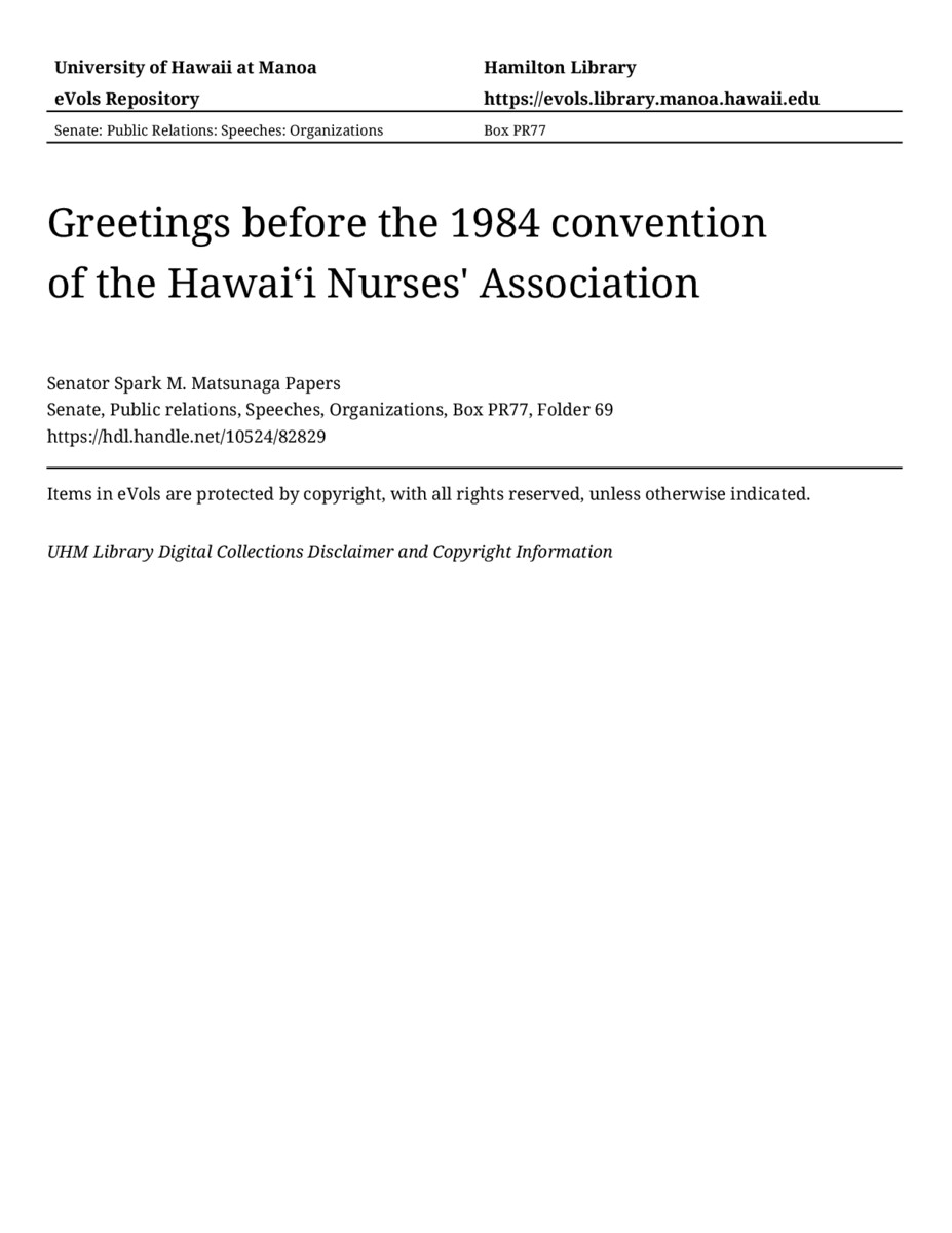 - Greetings before the 1984 convention of the Hawaiʻi Nurses' Association