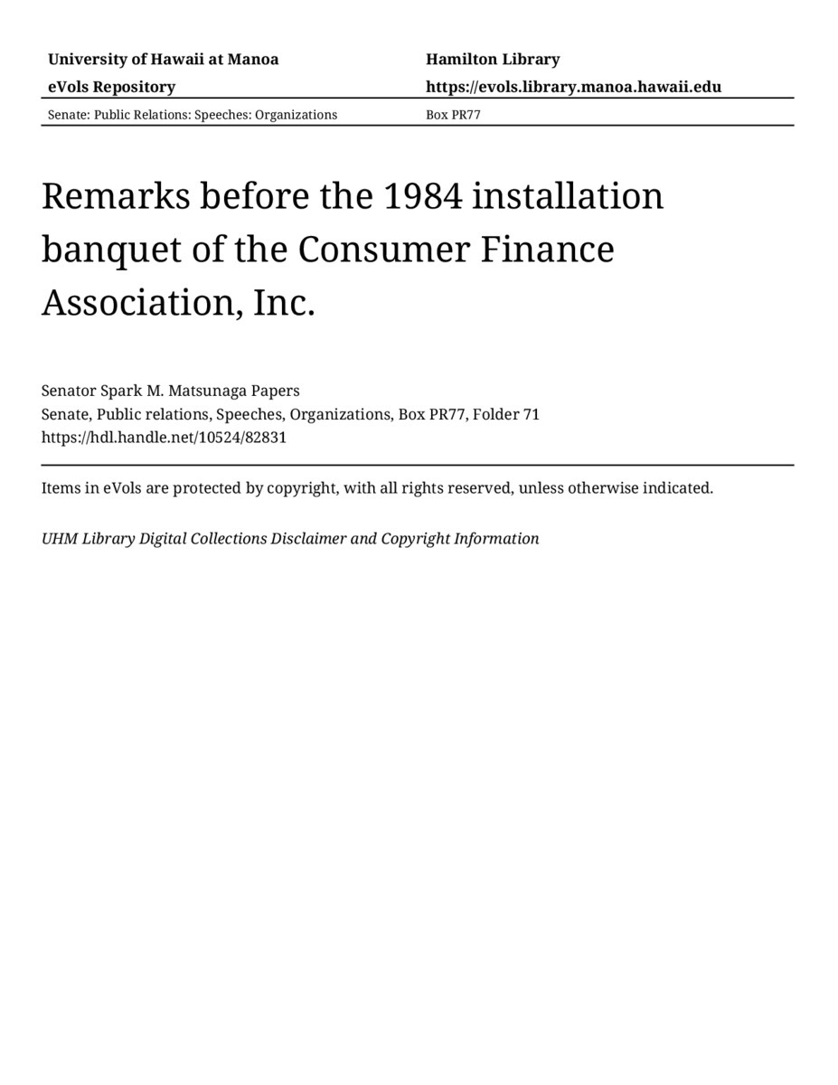 - Remarks before the 1984 installation banquet of the Consumer Finance Association, Inc.