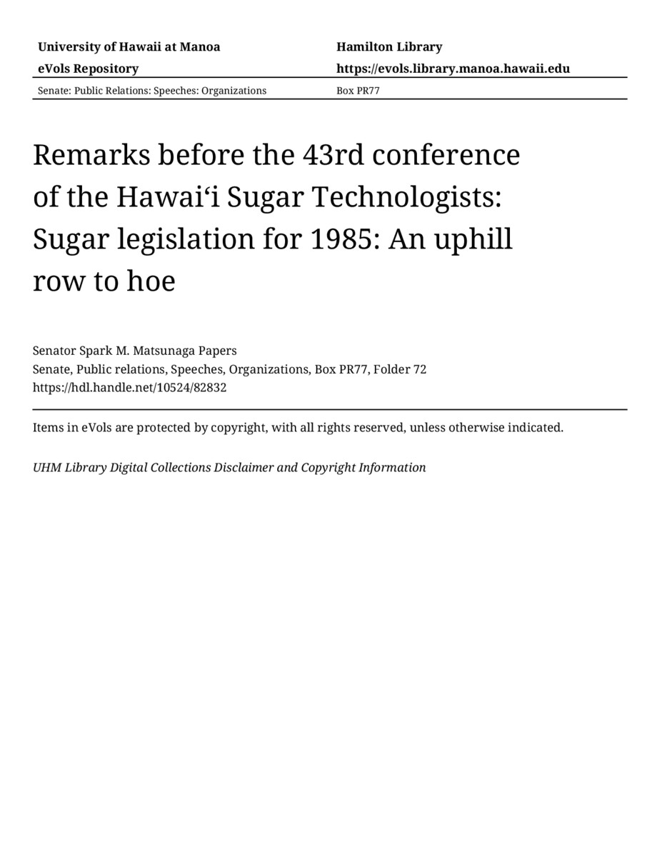 Remarks before the 43rd conference of the Hawaiʻi Sugar Technologists: Sugar legislation for 1985: An uphill row to hoe
