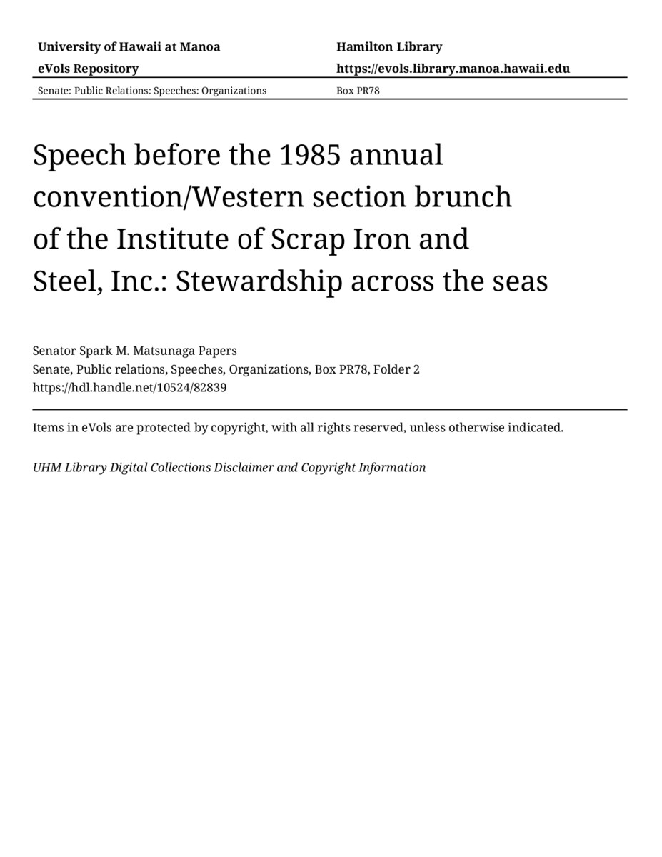 Speech before the 1985 annual convention/Western section brunch of the Institute of Scrap Iron and Steel, Inc.: Stewardship across the seas, 01/13/85, Senate, Public relations, Speeches, Organizations, Box PR78, Folder 2, Senator Spark M. Matsunaga Papers, Hawaiʻi Congressional Papers Collection, University of Hawaiʻi at Mānoa Library, Honolulu, HI. https://omekas-congress.lib.wvu.edu/catalog/10524_82839 (accessed April 10, 2026).