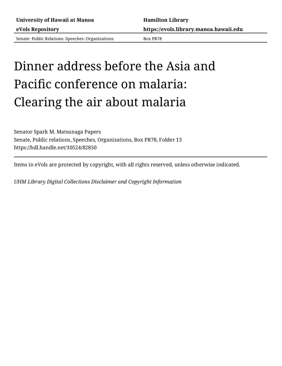 - Dinner address before the Asia and Pacific conference on malaria: Clearing the air about malaria