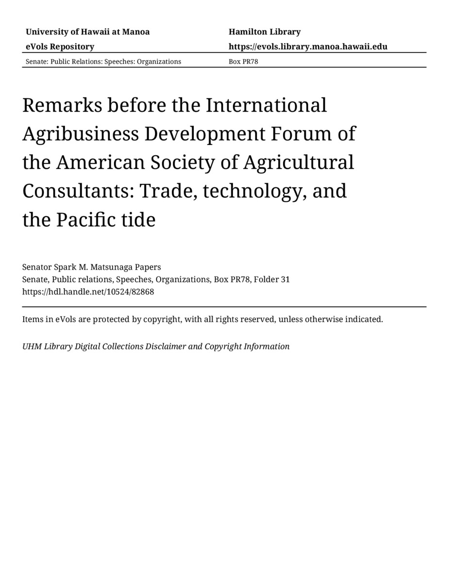 Remarks before the International Agribusiness Development Forum of the American Society of Agricultural Consultants: Trade, technology, and the Pacific tide, 10/14/85, Senate, Public relations, Speeches, Organizations, Box PR78, Folder 31, Senator Spark M. Matsunaga Papers, Hawaiʻi Congressional Papers Collection, University of Hawaiʻi at Mānoa Library, Honolulu, HI. https://omekas-congress.lib.wvu.edu/catalog/10524_82868 (accessed April 21, 2026).