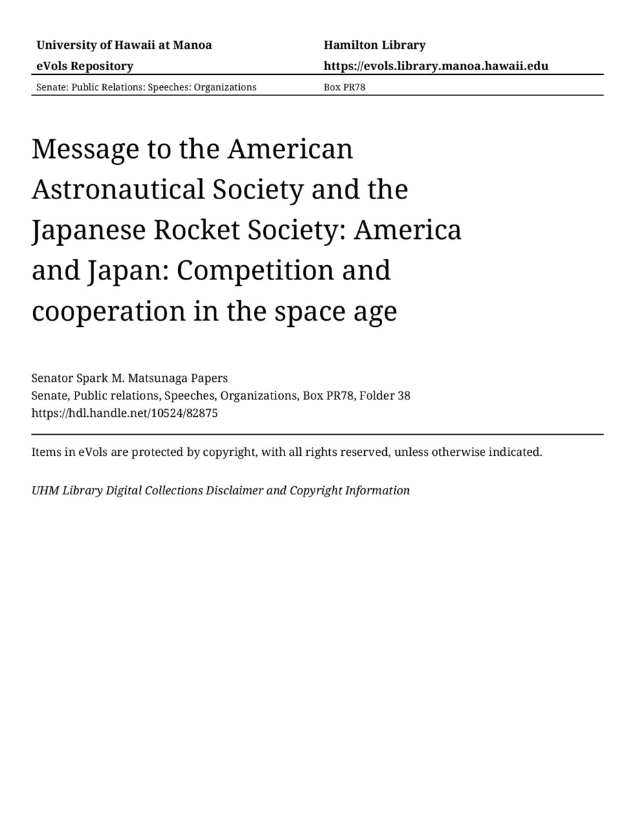 Message to the American Astronautical Society and the Japanese Rocket Society: America and Japan: Competition and cooperation in the space age, 12/16/85, Senate, Public relations, Speeches, Organizations, Box PR78, Folder 38, Senator Spark M. Matsunaga Papers, Hawaiʻi Congressional Papers Collection, University of Hawaiʻi at Mānoa Library, Honolulu, HI. https://omekas-congress.lib.wvu.edu/catalog/10524_82875 (accessed April 09, 2026).