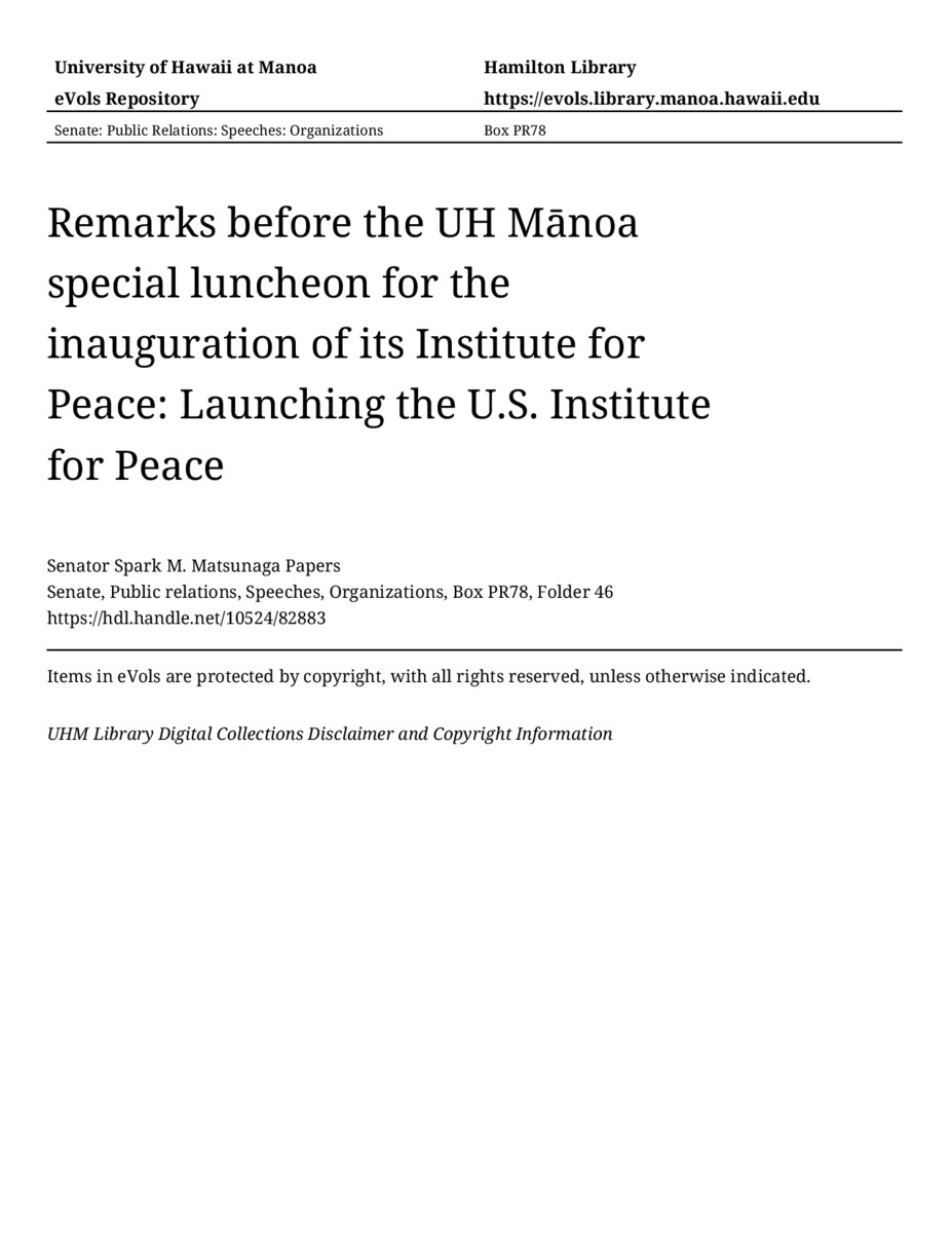 - Remarks before the UH Mānoa special luncheon for the inauguration of its Institute for Peace: Launching the U.S. Institute for Peace