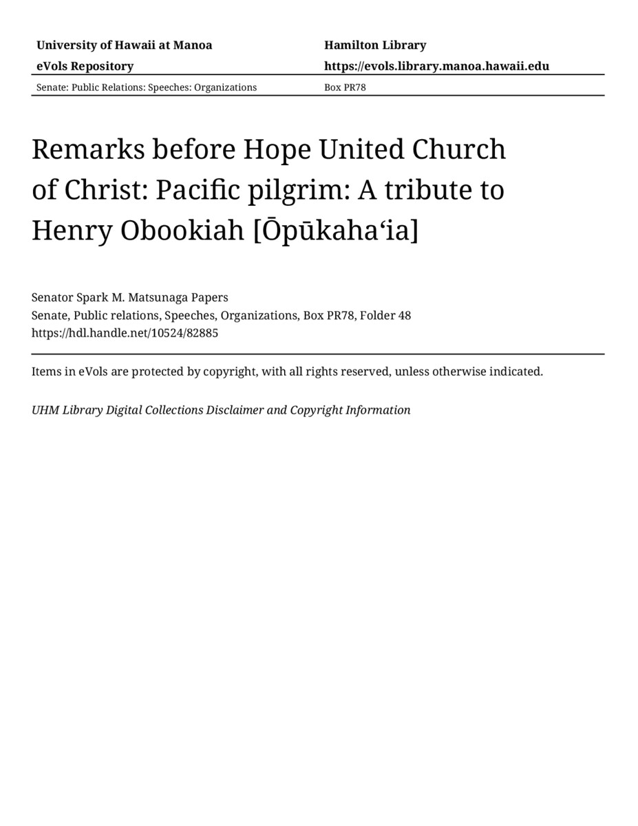 - Remarks before Hope United Church of Christ: Pacific pilgrim: A tribute to Henry Obookiah [Ōpūkahaʻia]