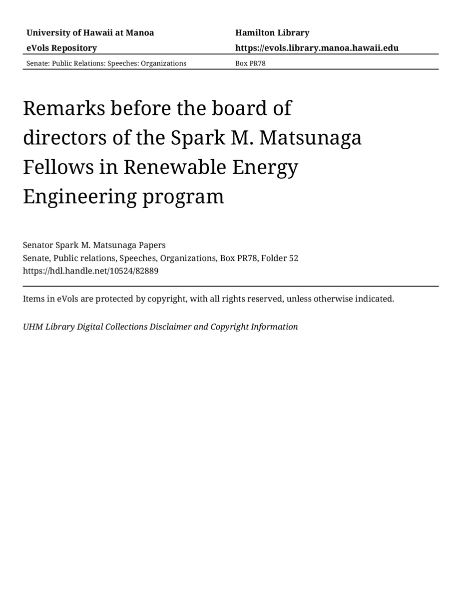 - Remarks before the board of directors of the Spark M. Matsunaga Fellows in Renewable Energy Engineering program
