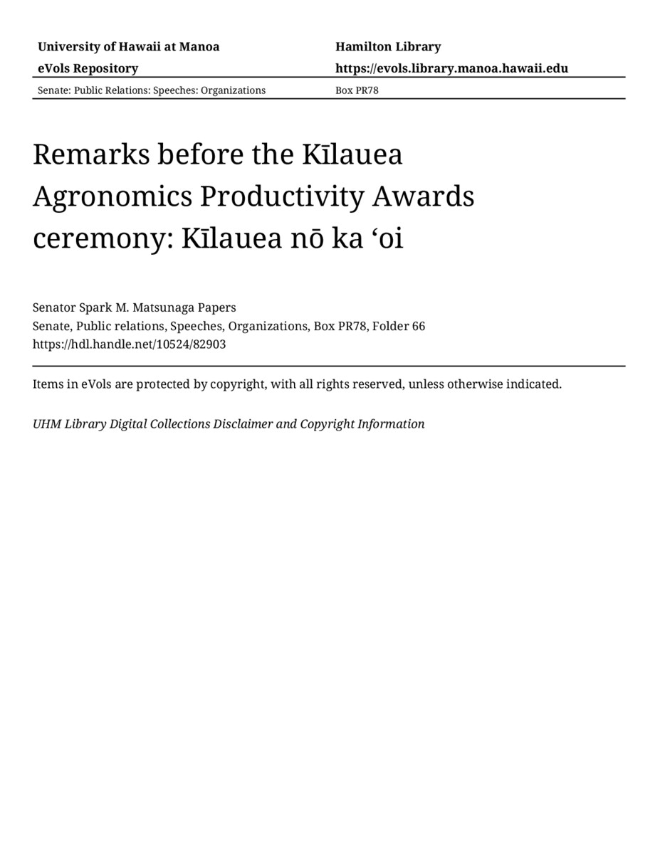 - Remarks before the Kīlauea Agronomics Productivity Awards ceremony: Kīlauea nō ka ʻoi