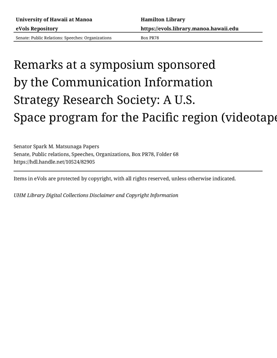 Remarks at a symposium sponsored by the Communication Information Strategy Research Society: A U.S. Space program for the Pacific region (videotaped), 05/30/86, Senate, Public relations, Speeches, Organizations, Box PR78, Folder 68, Senator Spark M. Matsunaga Papers, Hawaiʻi Congressional Papers Collection, University of Hawaiʻi at Mānoa Library, Honolulu, HI. https://omekas-congress.lib.wvu.edu/catalog/10524_82905 (accessed April 23, 2026).
