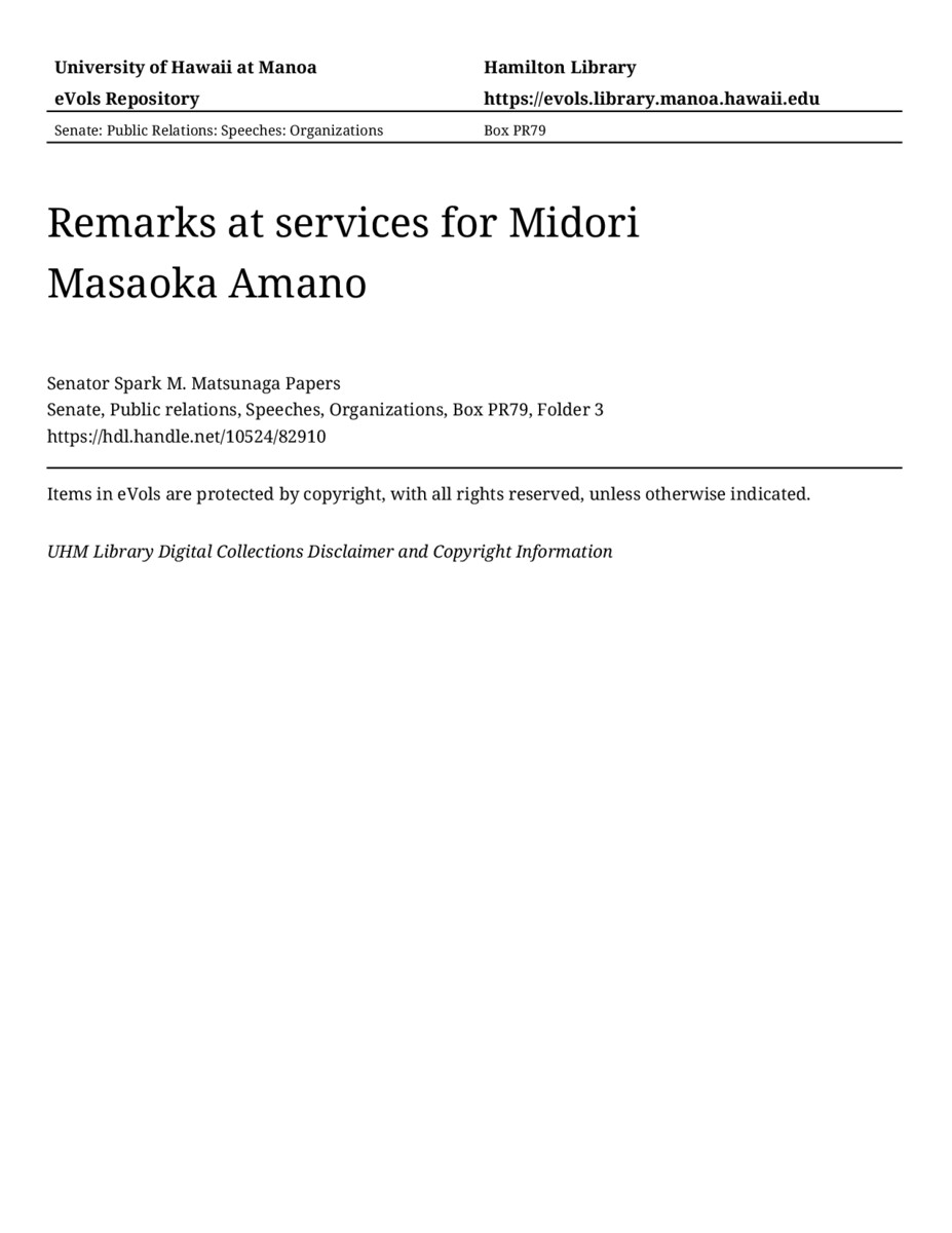 Remarks at services for Midori Masaoka Amano, 07/15/86, Senate, Public relations, Speeches, Organizations, Box PR79, Folder 3, Senator Spark M. Matsunaga Papers, Hawaiʻi Congressional Papers Collection, University of Hawaiʻi at Mānoa Library, Honolulu, HI. https://omekas-congress.lib.wvu.edu/catalog/10524_82910 (accessed April 22, 2026).