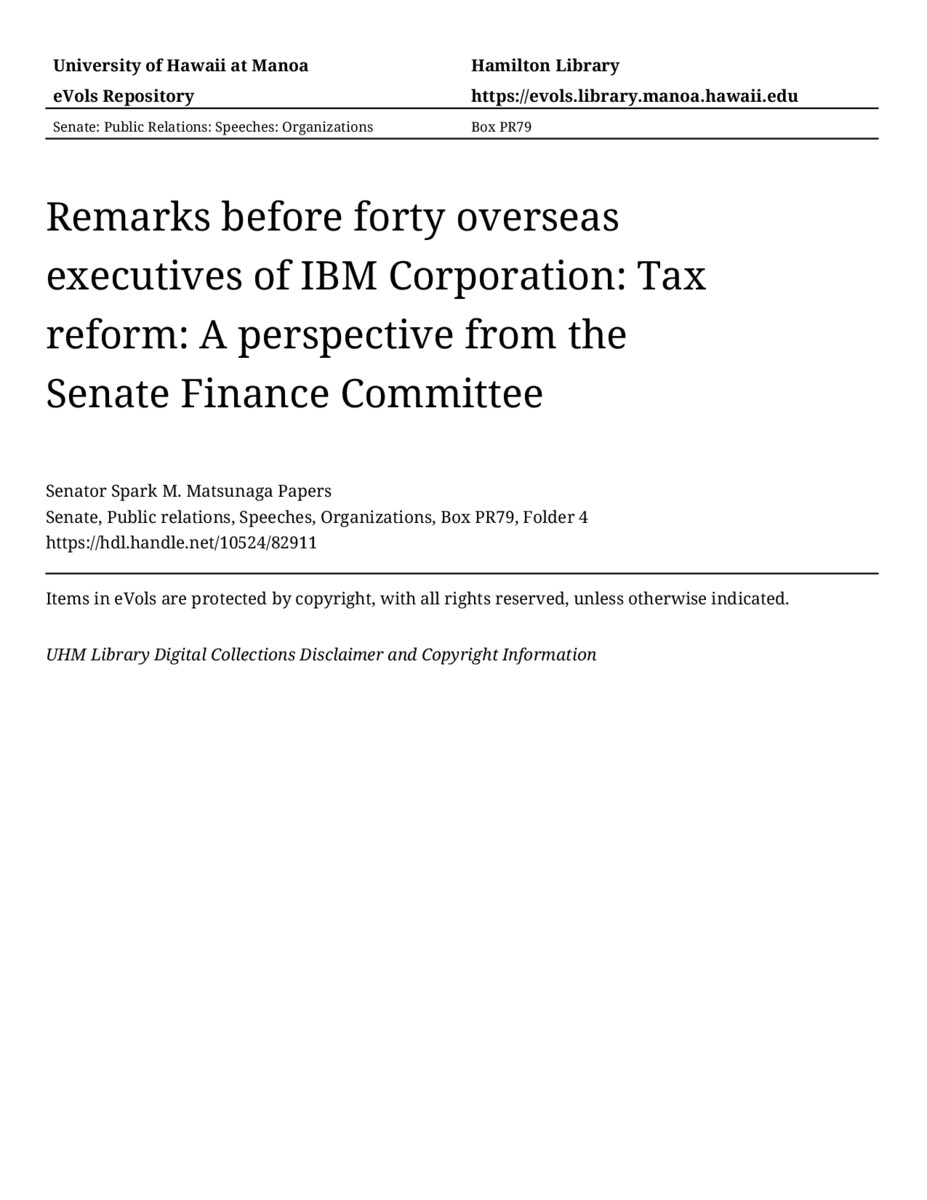 - Remarks before forty overseas executives of IBM Corporation: Tax reform: A perspective from the Senate Finance Committee