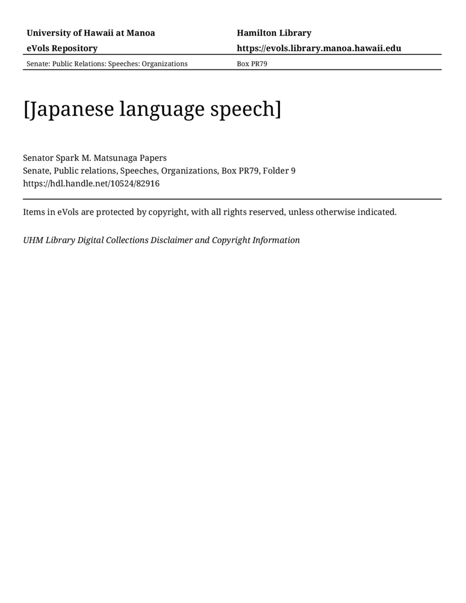 [Japanese language speech], 10/01/86, Senate, Public relations, Speeches, Organizations, Box PR79, Folder 9, Senator Spark M. Matsunaga Papers, Hawaiʻi Congressional Papers Collection, University of Hawaiʻi at Mānoa Library, Honolulu, HI. https://omekas-congress.lib.wvu.edu/catalog/10524_82916 (accessed April 23, 2026).