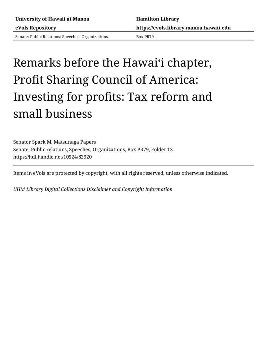 - Remarks before the Hawaiʻi chapter, Profit Sharing Council of America: Investing for profits: Tax reform and small business