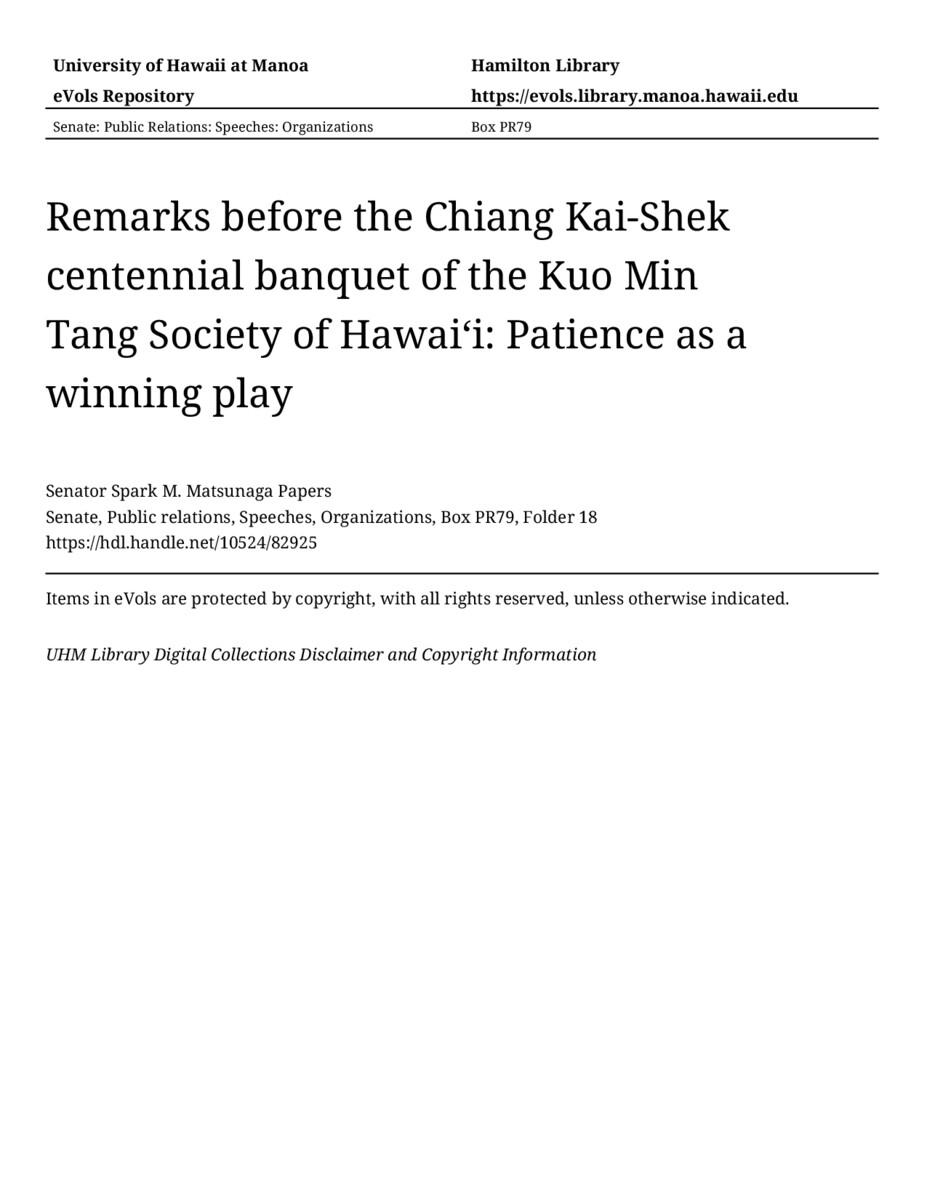 - Remarks before the Chiang Kai-Shek centennial banquet of the Kuo Min Tang Society of Hawaiʻi: Patience as a winning play
