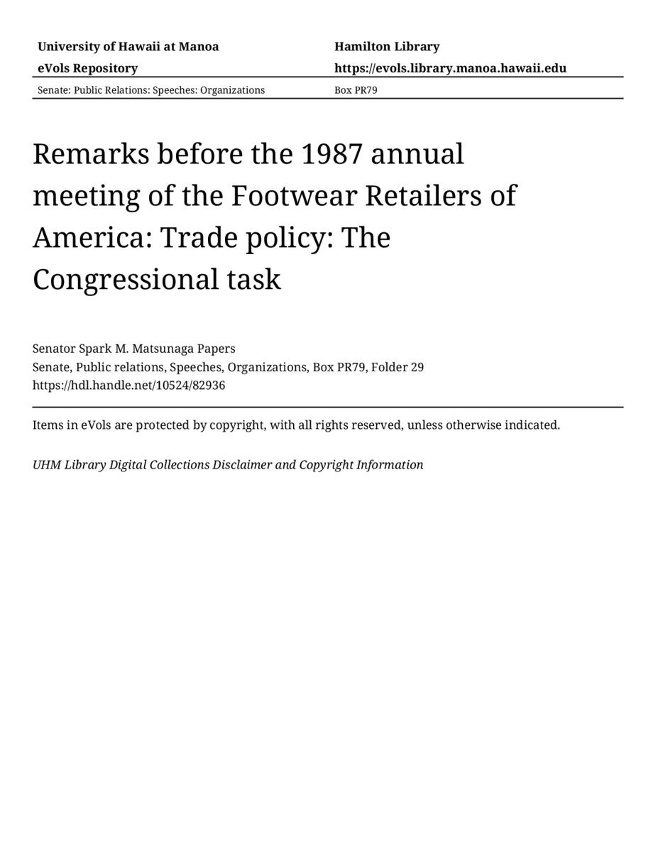 - Remarks before the 1987 annual meeting of the Footwear Retailers of America: Trade policy: The Congressional task