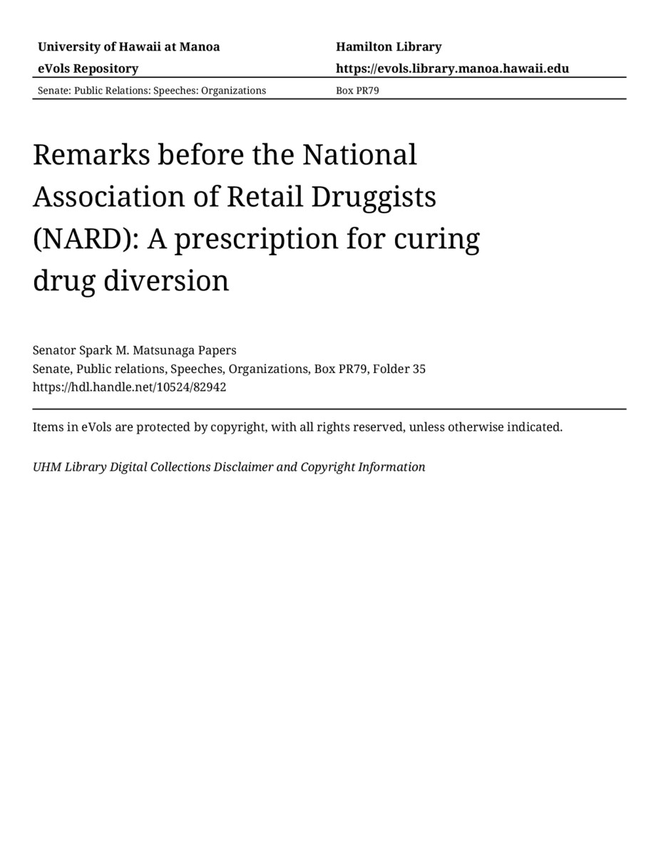 - Remarks before the National Association of Retail Druggists (NARD): A prescription for curing drug diversion