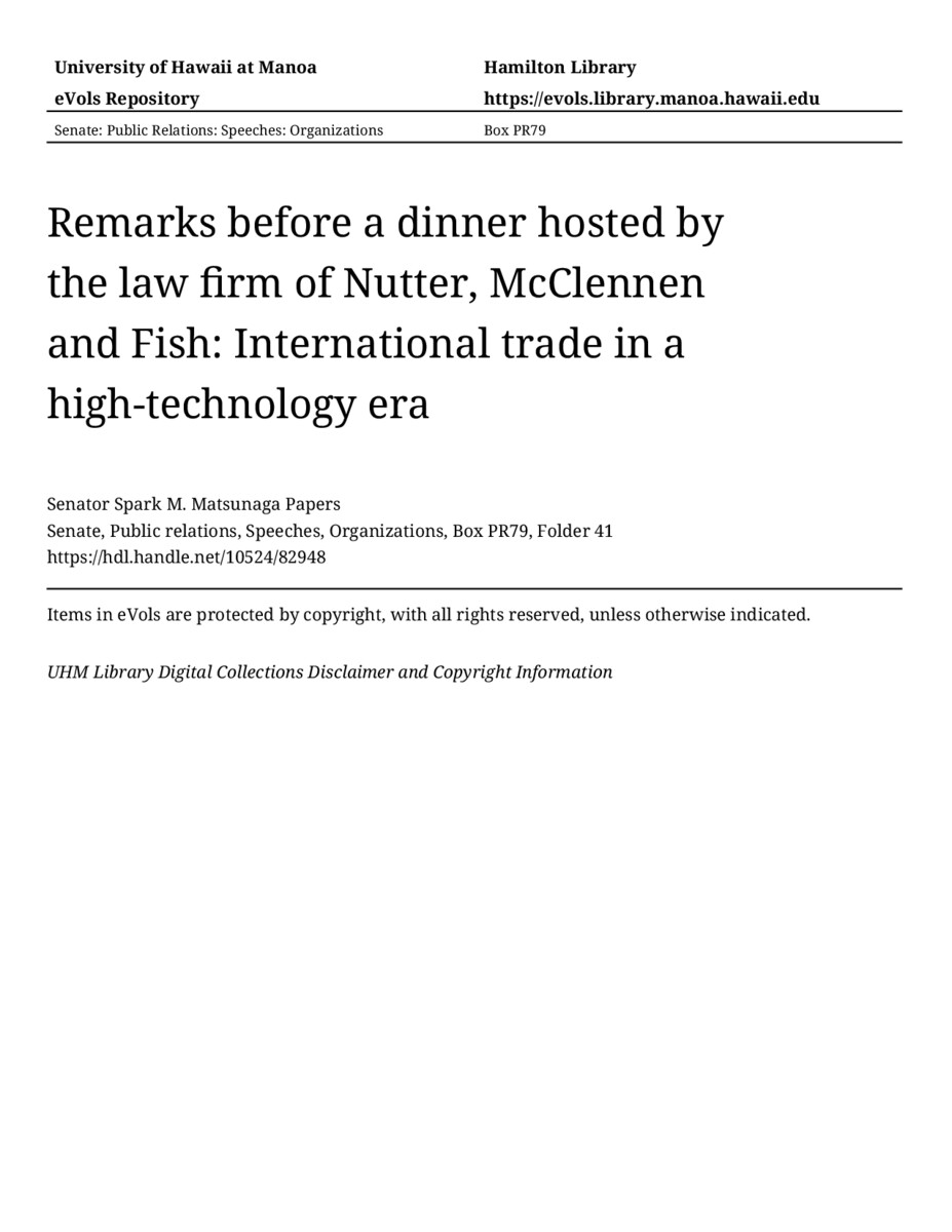 - Remarks before a dinner hosted by the law firm of Nutter, McClennen and Fish: International trade in a high-technology era