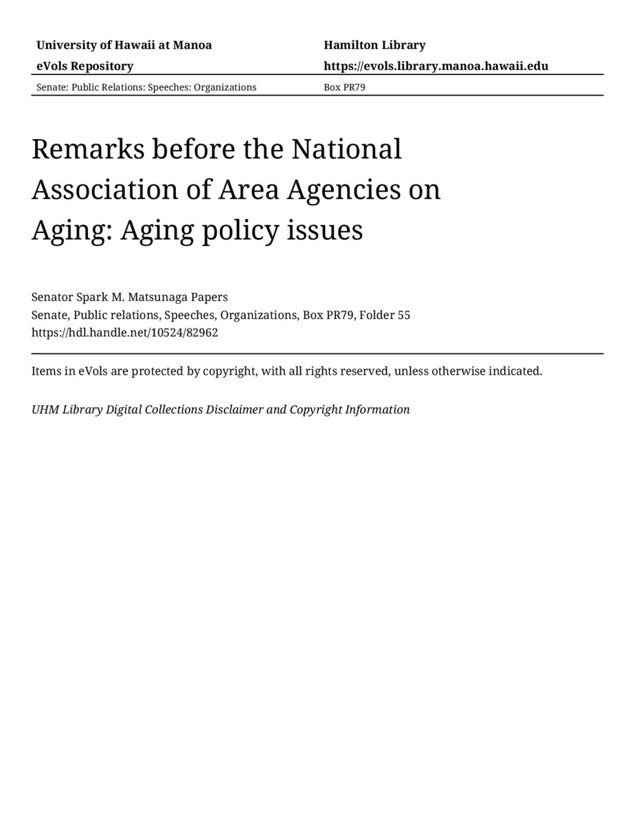 - Remarks before the National Association of Area Agencies on Aging: Aging policy issues