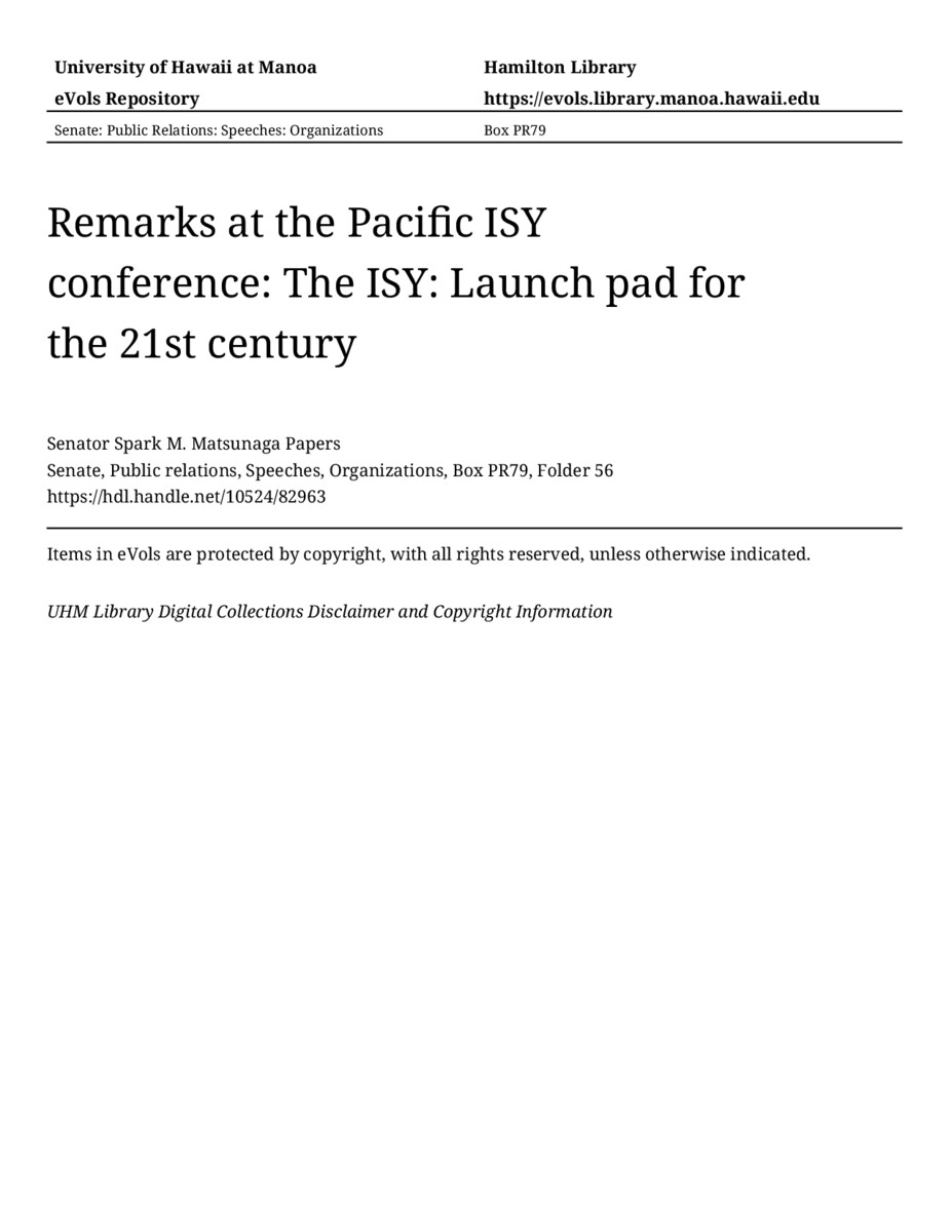 - Remarks at the Pacific ISY conference: The ISY: Launch pad for the 21st century