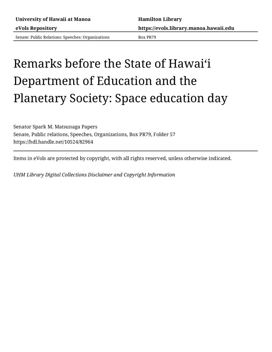 - Remarks before the State of Hawaiʻi Department of Education and the Planetary Society: Space education day