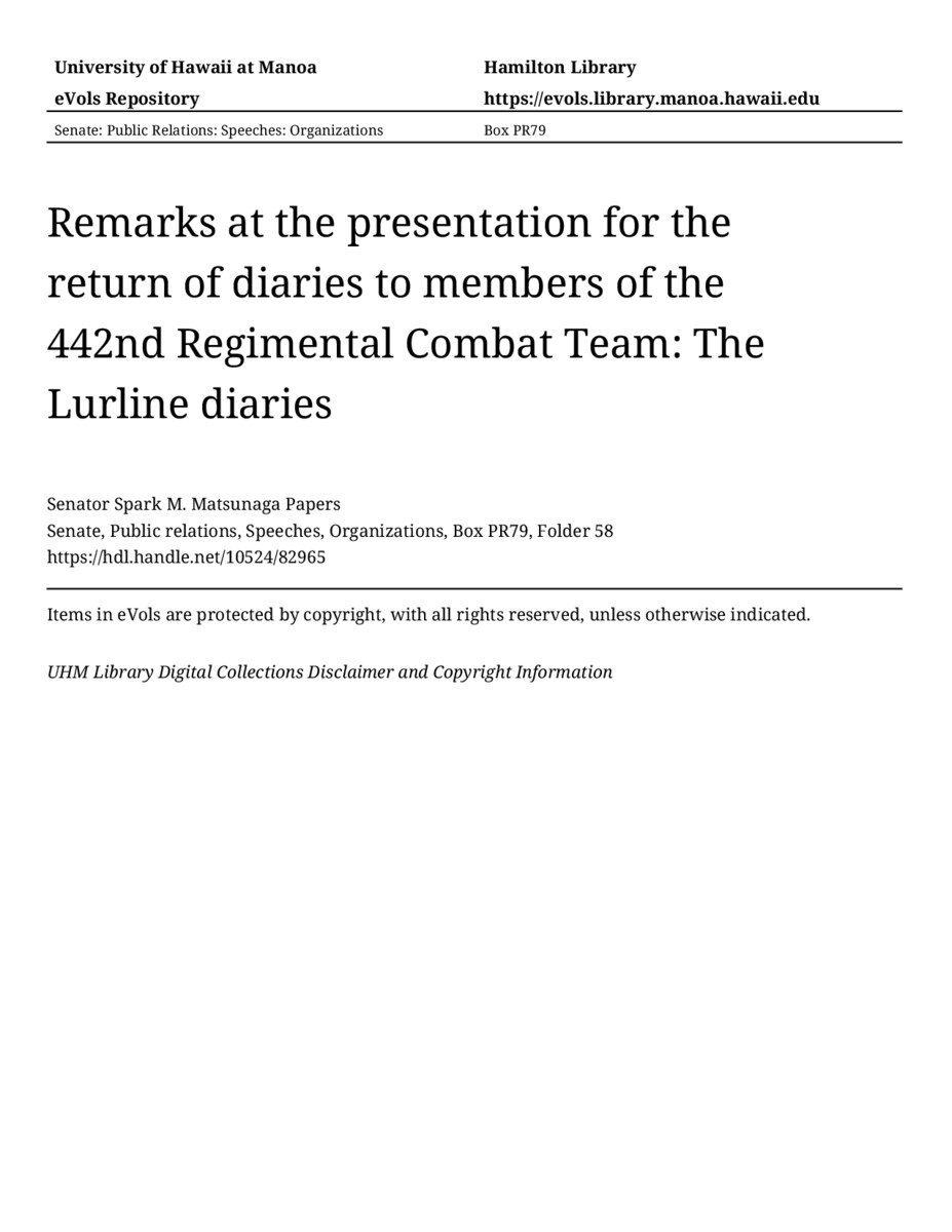 - Remarks at the presentation for the return of diaries to members of the 442nd Regimental Combat Team: The Lurline diaries
