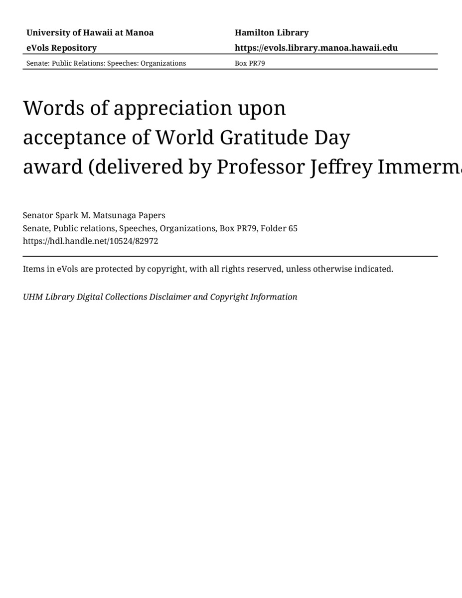 - Words of appreciation upon acceptance of World Gratitude Day award (delivered by Professor Jeffrey Immerman)