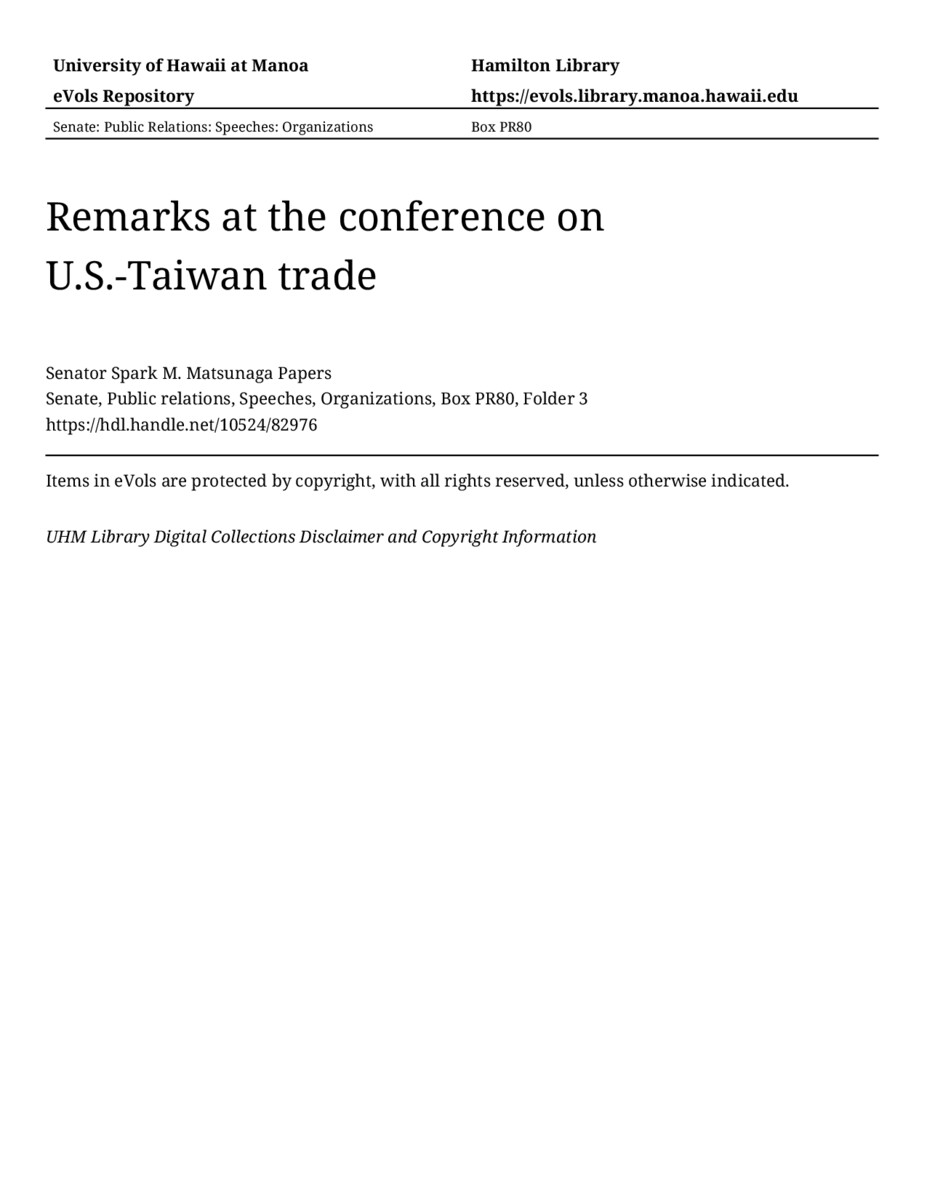 Remarks at the conference on U.S.-Taiwan trade, 10/23/87, Senate, Public relations, Speeches, Organizations, Box PR80, Folder 3, Senator Spark M. Matsunaga Papers, Hawaiʻi Congressional Papers Collection, University of Hawaiʻi at Mānoa Library, Honolulu, HI. https://omekas-congress.lib.wvu.edu/catalog/10524_82976 (accessed April 22, 2026).