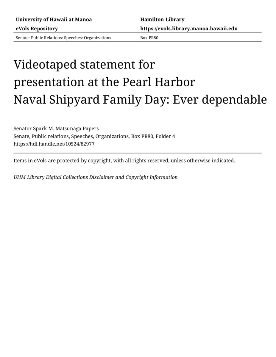 - Videotaped statement for presentation at the Pearl Harbor Naval Shipyard Family Day: Ever dependable