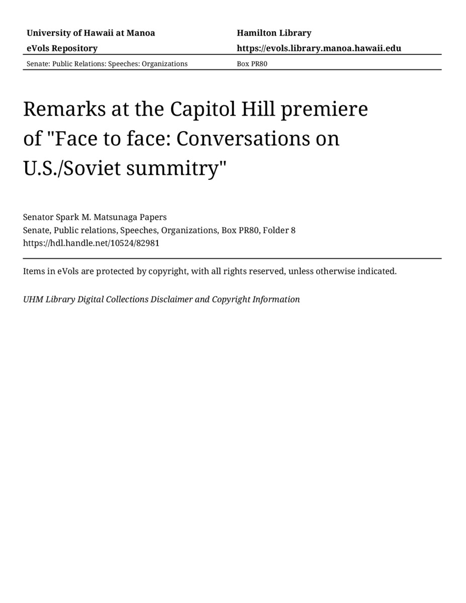 - Remarks at the Capitol Hill premiere of "Face to face: Conversations on U.S./Soviet summitry"