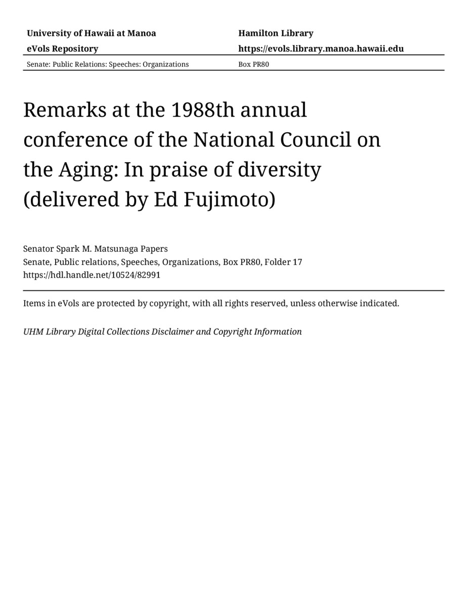 Remarks at the 1988th annual conference of the National Council on the Aging: In praise of diversity (delivered by Ed Fujimoto)