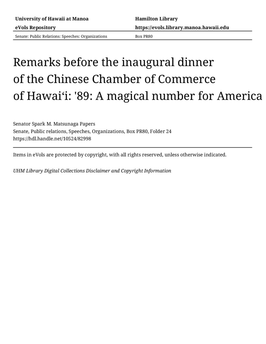 - Remarks before the inaugural dinner of the Chinese Chamber of Commerce of Hawaiʻi: '89: A magical number for America