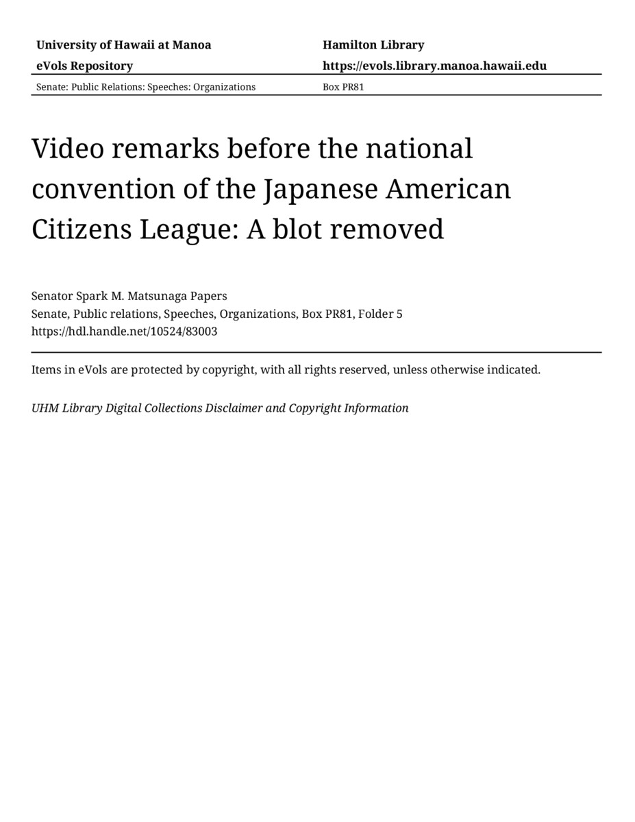 - Video remarks before the national convention of the Japanese American Citizens League: A blot removed