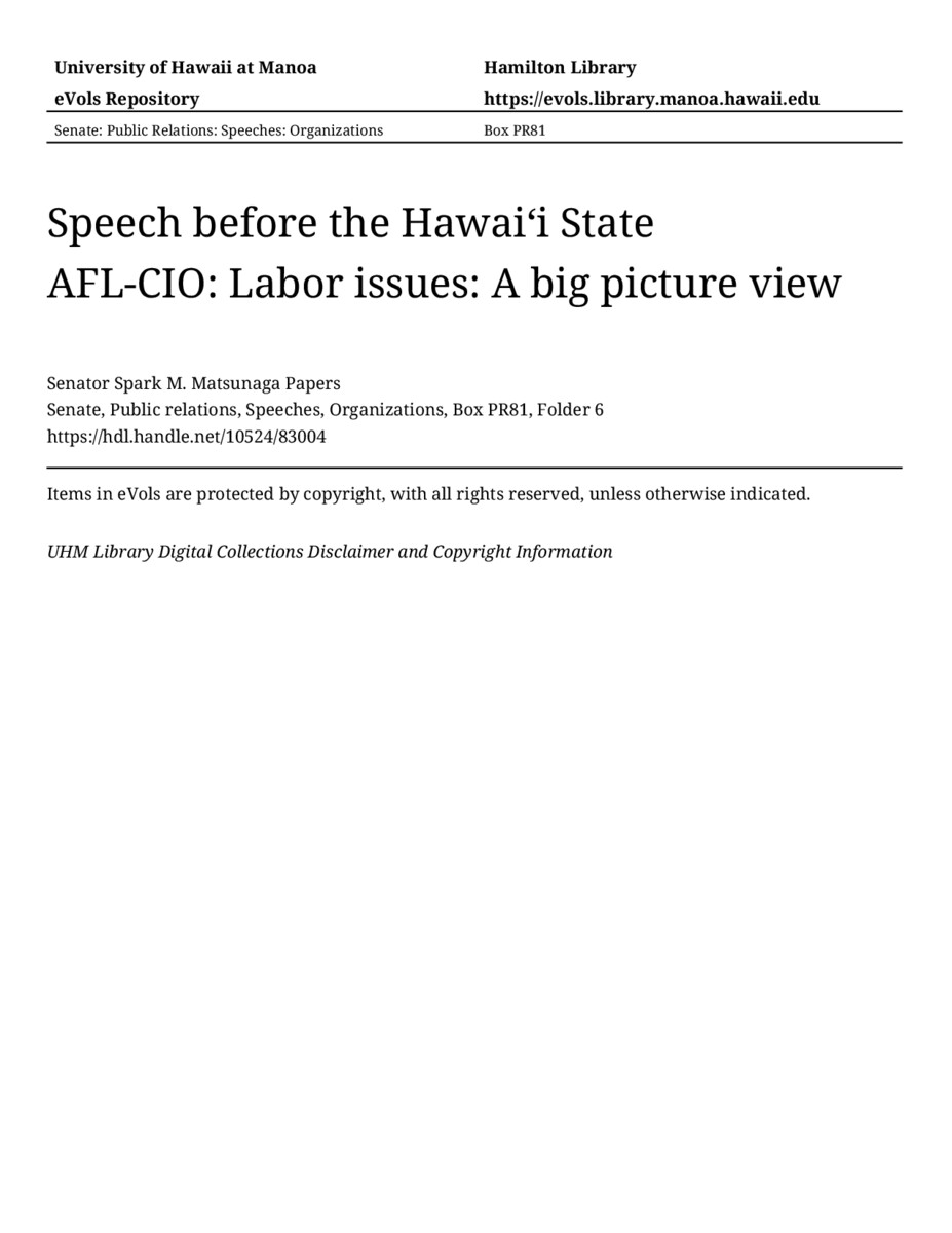 - Speech before the Hawaiʻi State AFL-CIO: Labor issues: A big picture view