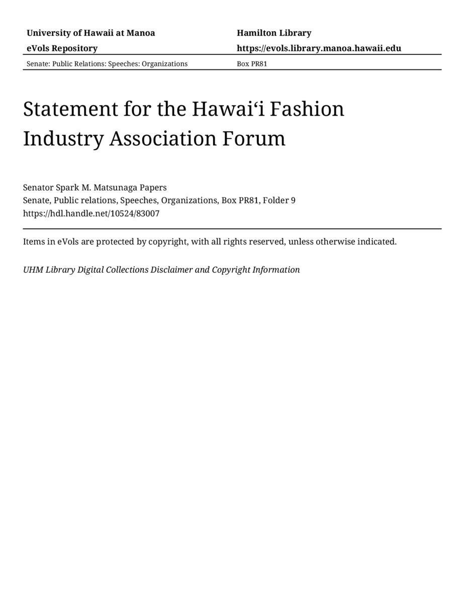 Statement for the Hawaiʻi Fashion Industry Association Forum, 10/31/88, Senate, Public relations, Speeches, Organizations, Box PR81, Folder 9, Senator Spark M. Matsunaga Papers, Hawaiʻi Congressional Papers Collection, University of Hawaiʻi at Mānoa Library, Honolulu, HI. https://omekas-congress.lib.wvu.edu/catalog/10524_83007 (accessed April 19, 2026).